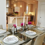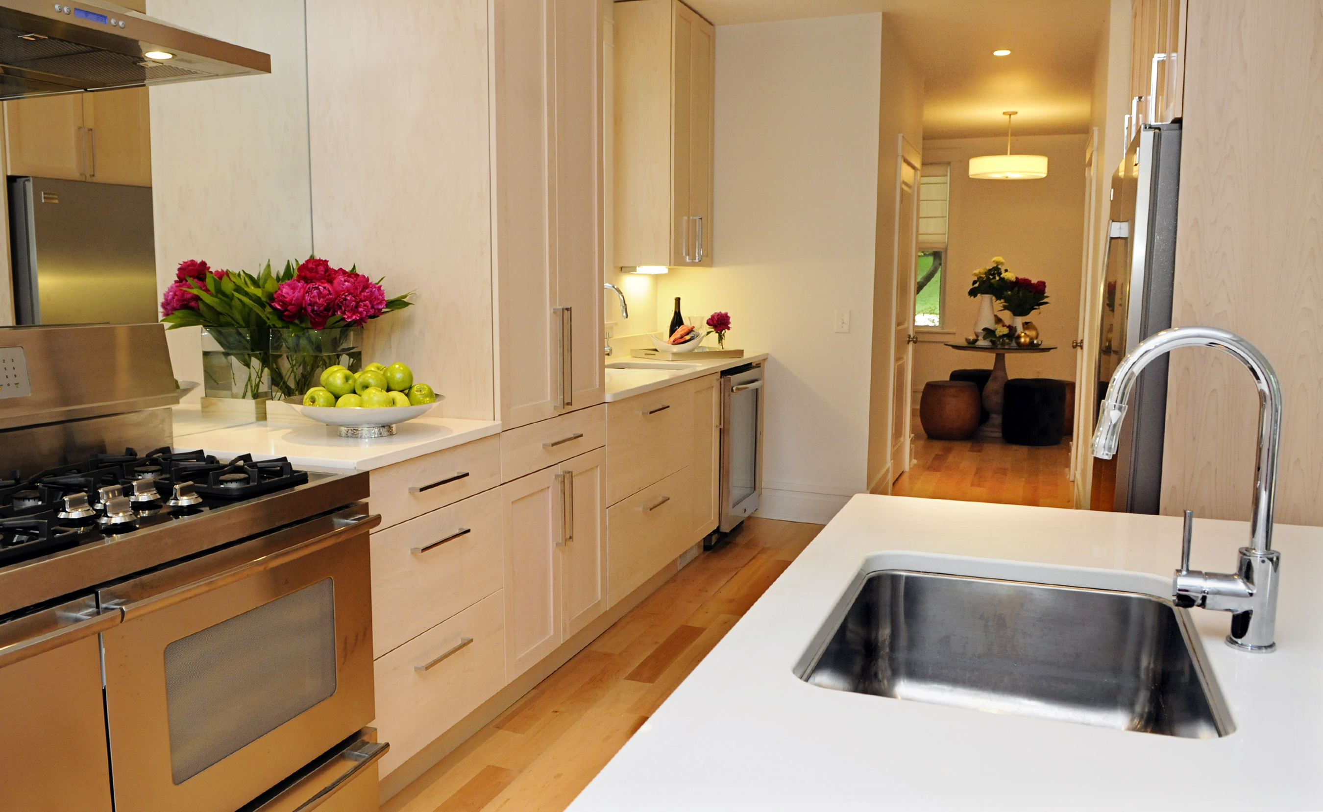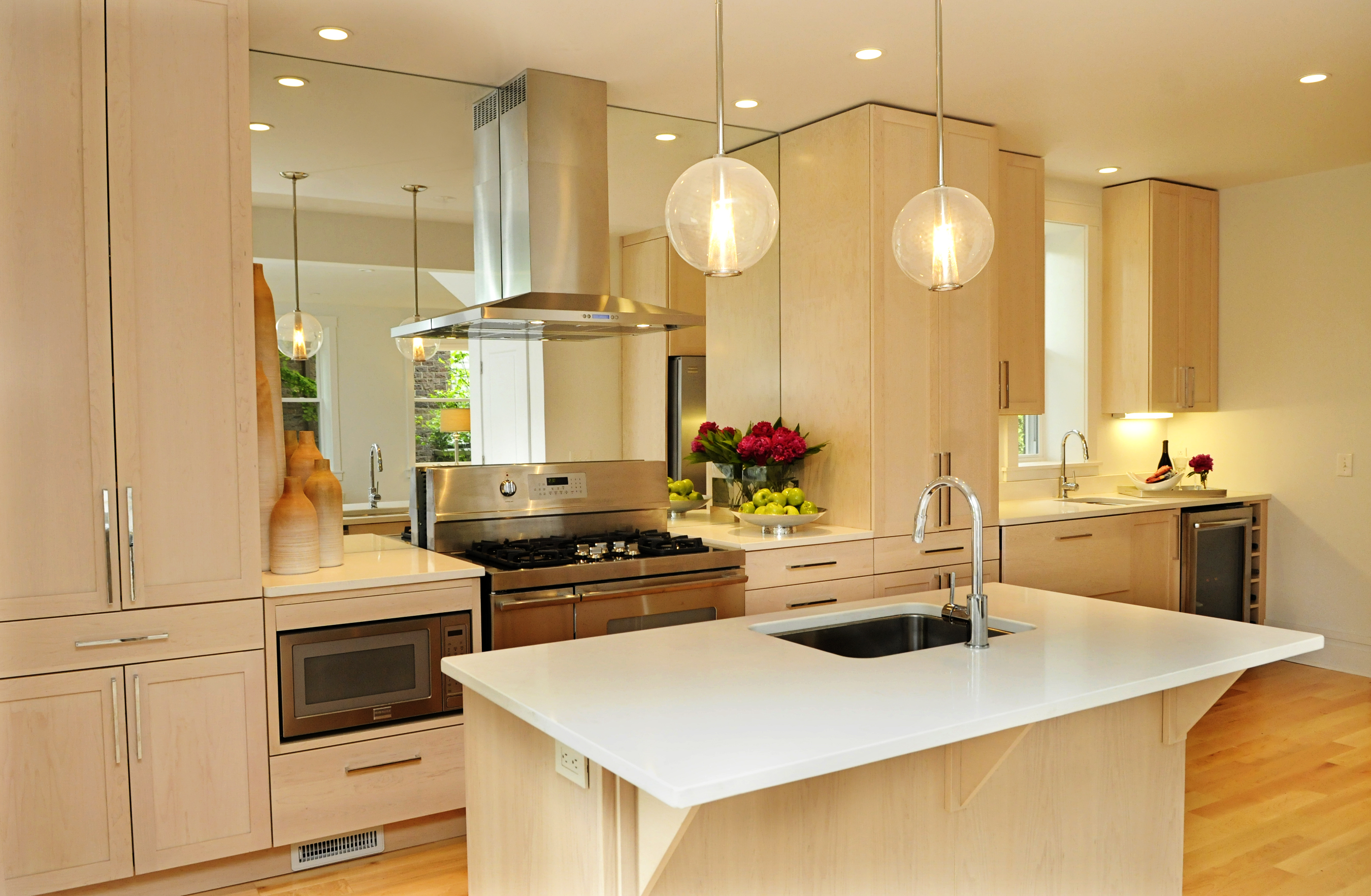 The open kitchen features custom, hand-stained maple cabinetry, locally sourced and crafted in North Central Pennsylvania and accented by polished chrome bar pulls. Glass pendants gracefully spotlight a center island with quartz countertops. Professional series stainless steel appliances include a 40”, dual fuel range; 72” refrigerator and freezer; wine refrigerator, dishwasher and microwave. The kitchen leads to a private breakfast terrace overlooking the rear lawn and garden.